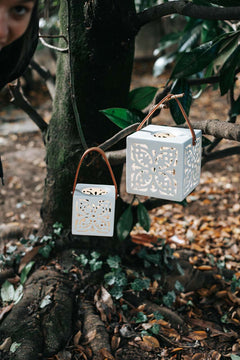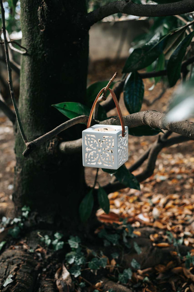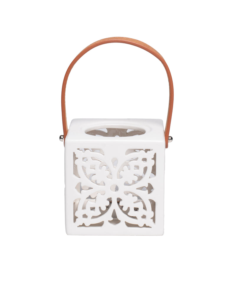 Lanterna traforata in ceramica bianca lucida 12X10.3X10cm con led. Batterie stilo AA non incluse