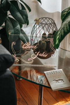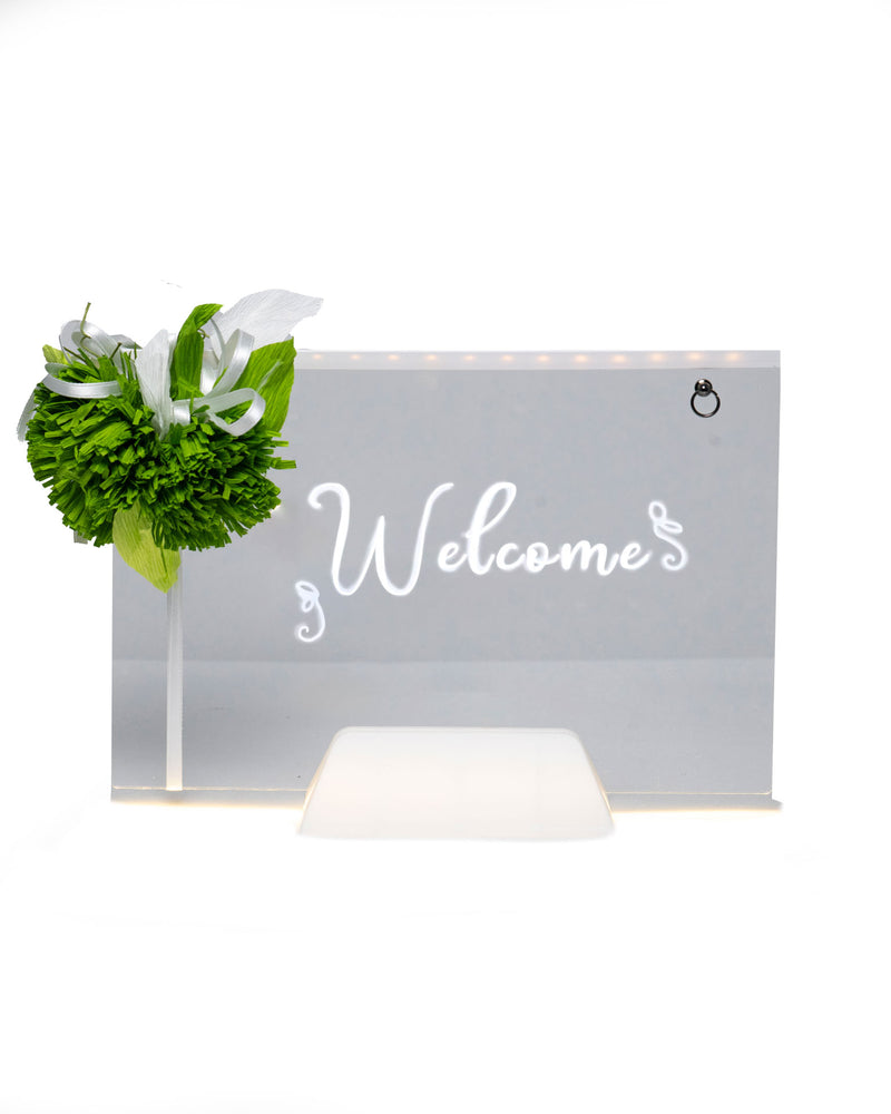 Lavagna acrilico scrivibile con led. 30x20 cm con catenella per essere appesa e base per appoggio. 7 pennarelli e accessori